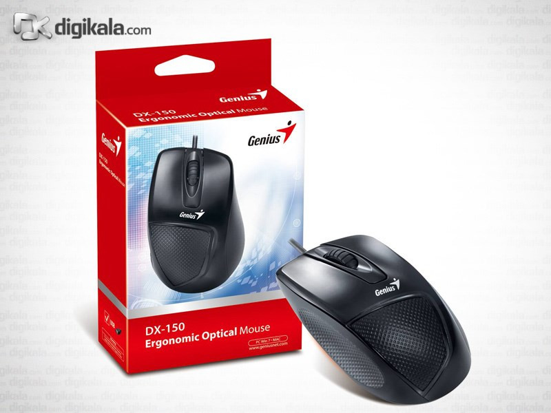 • • DX-150 یک ماوس ارگونومیک ساخت کمپانی جنیوس است. این ماوس از حسگر اپتیکال بت دقت 1200dpi بهره میبرد که در این رده دقت بسیار خوبی است و میتوان گفت دقتی در حدود سه برابر بیشتر از یک ماوس معمولی به شما ارایه میکند تا بتوانید به راحتی و با دقت بالا ماوس خود را کنترل نمایید. این ماوس زیبا به صورتی طراحی و ساخته شده است تا برای کار کردن با هر دو دست راحت و قابل استفاده باشد. ماوس جنیوس DX-150 در دو رنگ مشکی و نارنجی طراحی شده و برای استفاده در کنار لپتاپ و کامپیوتر با مصارف خانگی انتخاب مناسبی است. نصب، راهاندازی و استفاه از این ماوس بسیار ساده است و فقط کافیست شما این ماوس را به پورت USB لپتاپ و یا کامپیوتر خود متصل نمایید تا بتوانید از آن استفاده نمایید.